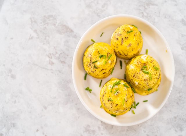 When you’re on the go and don’t have time for breakfast, egg bites are the perfect solution. According to Tateossian, “A standard two-egg bite serving delivers around 12–14 grams of high-quality protein, while egg white bites provide the same satiety with fewer calories and less fat, making them a great option if you’re in a calorie deficit but still want to preserve muscle.” She explains, “Eggs are rich in leucine, an amino acid that signals the body to build and maintain muscle, which boosts metabolism and supports long-term fat burning. You can add spinach, mushrooms, or peppers for extra fiber and micronutrients.” For store-bought options, Tateossian warns to “check labels for hidden starches or excess sodium, but when made at home, they’re one of the cleanest, easiest high-protein snacks to keep fat loss on track!”